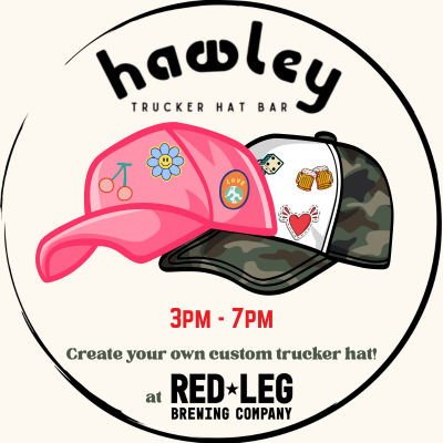 Hawley Trucker Hats will be at Red Leg from 3-7pm to help you create your own trucker hat creation- choose your hat, select some fun patches, and Hawley will handle the rest!